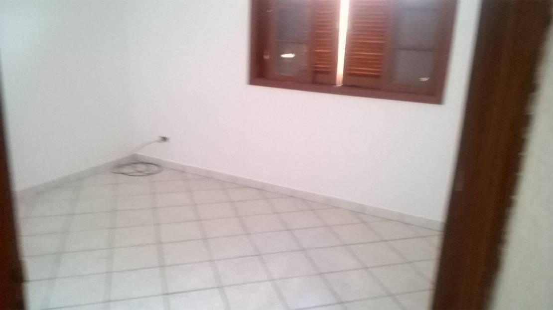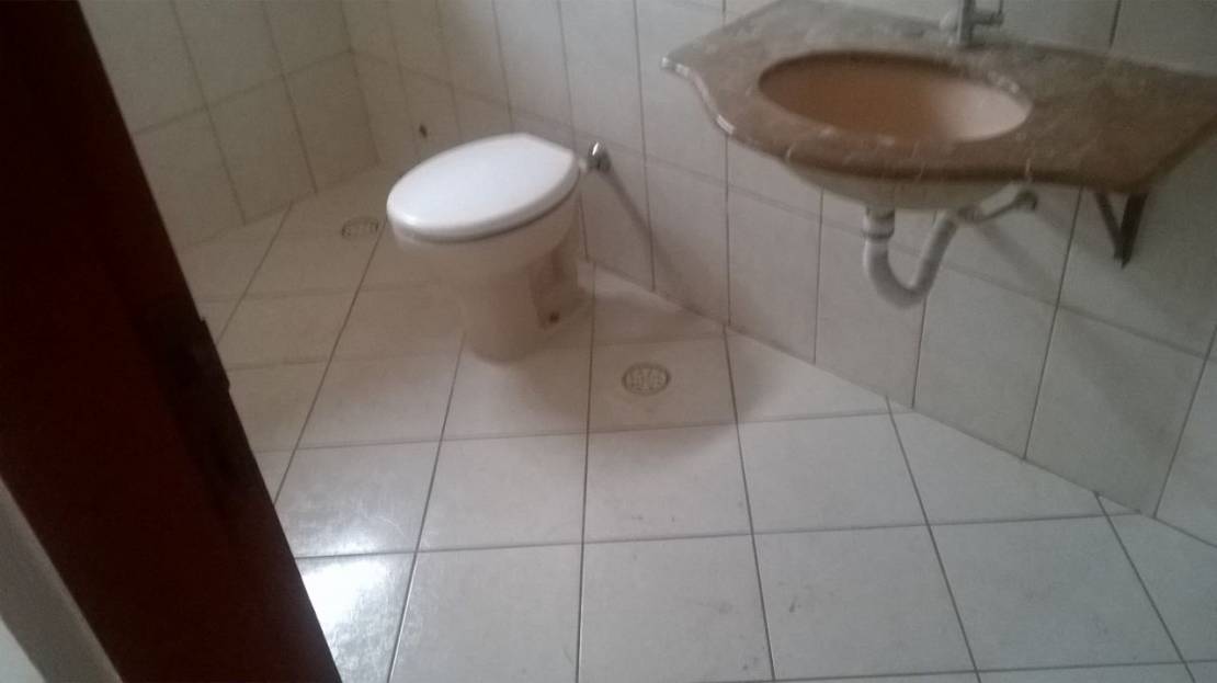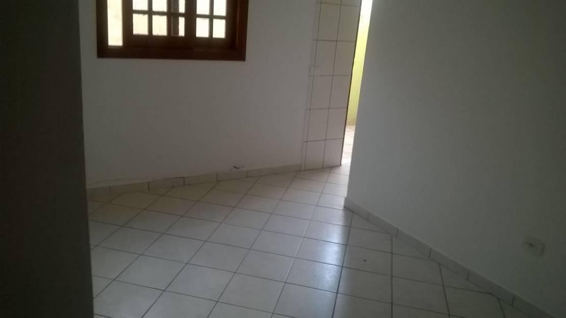 Casa térrea com dois dormitórios, sendo uma suite e dois banheiros com sala, cozinha e uma vaga na garagem.